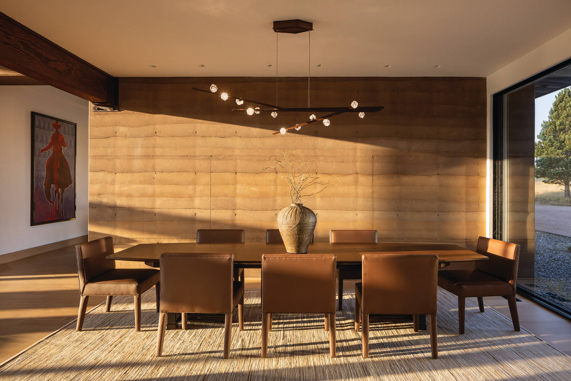 The house is made of rammed earth, which isn’t immediately obvious from the outside—other than wondering how it blends in with the landscape so well—but the main wall in the dining room really showcases the material. Brandon Daigle of N38 Architecture was the architect, and Casper-based Alma Interiors did the interior design. JH