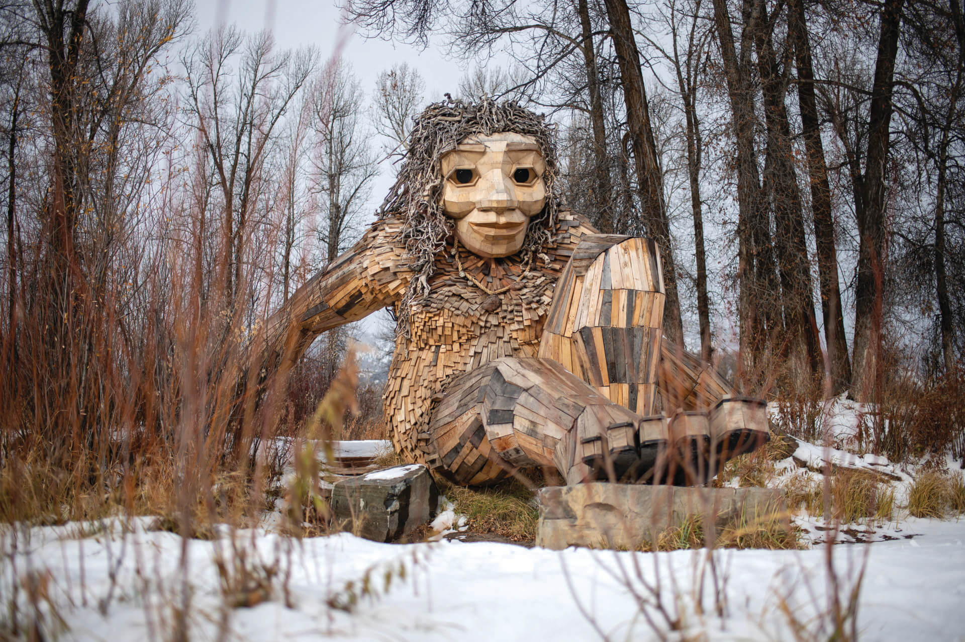 In winter, the park is a hub for cold-weather play—think sledding, cross-country skiing, and snowshoeing—and there’s even an avalanche beacon training area. In summer, families come to scramble over art installations, fish along the riverbank or in the stocked pond, or picnic under the cottonwoods. Year-round, local organizations use the park to hold a diversity of events, from a winter solstice celebration (shown here) to concerts and free kayak and paddleboard demos. R Park’s heart is a whimsical interactive sculpture, Mama Mimi, a giant troll made from reclaimed materials.