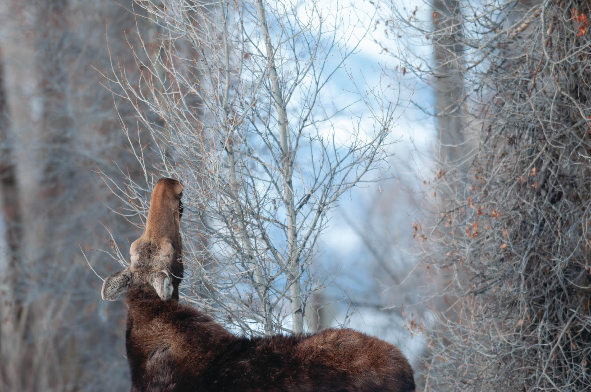 In forested habitat, like that found around Munger Mountain on the BTNF, “Moose can subsist from moving from tree well to tree well; they can access plenty of subalpine fir and spruce—enough to get them through their winter state of extended starvation,” Graham says. “Their bodies have evolved to pack on as many pounds as possible during the growing season and then draw on those reserves to make it through winter and spring until fresh green forage returns to the landscape.” The BTNF’s Egan says, “winter wildlife closures on the Bridger-Teton are contributing to healthy wildlife populations in the Greater Yellowstone Ecosystem. They are a powerful and respected tool to protect wintering wildlife on the landscape.”